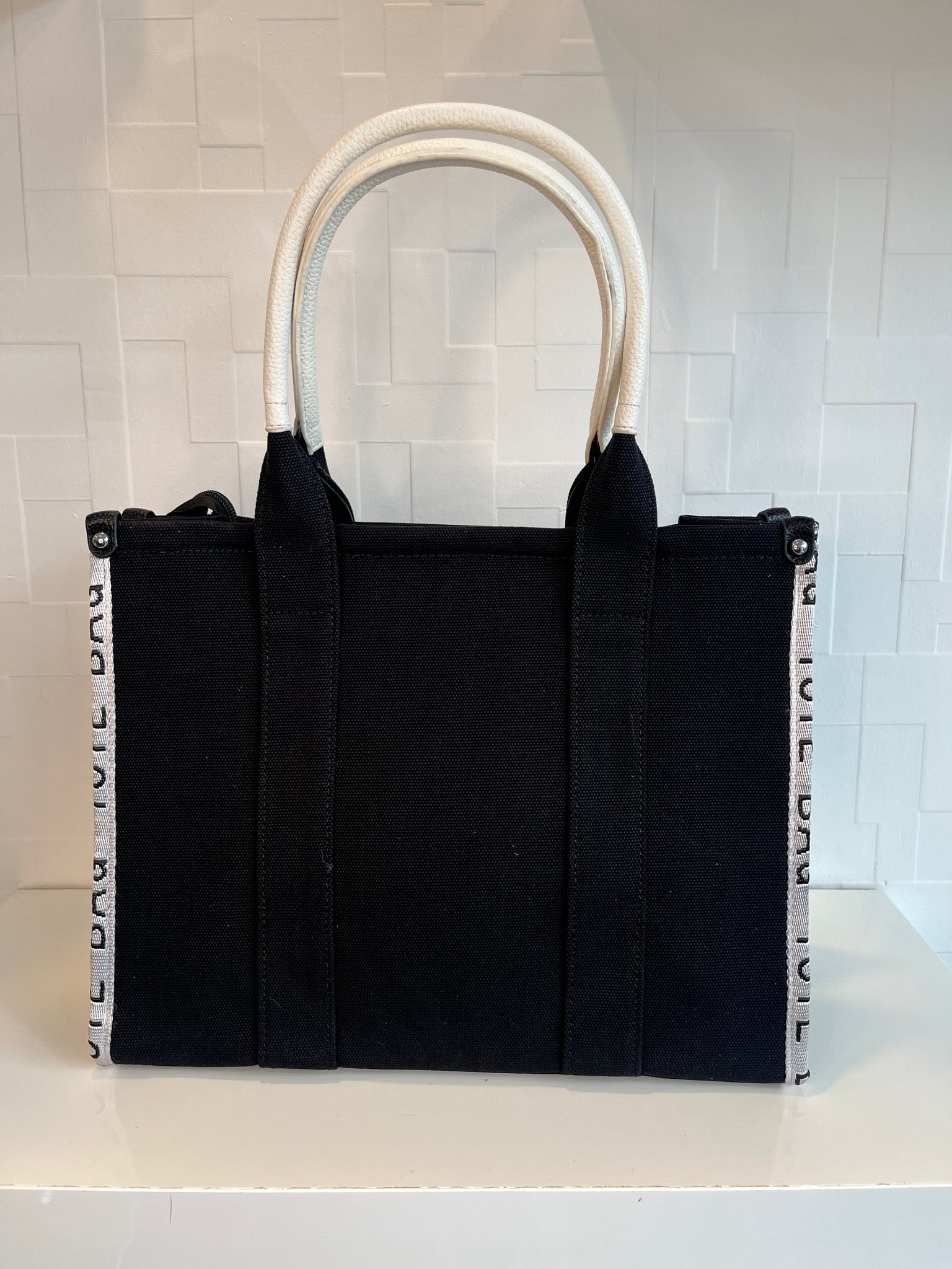Designer inspired tote bag in black canvas with pu leather handle and long strap which is detachable
