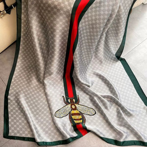 Elevate your wardrobe with this stunning faux satin scarf featuring a timeless bee print.