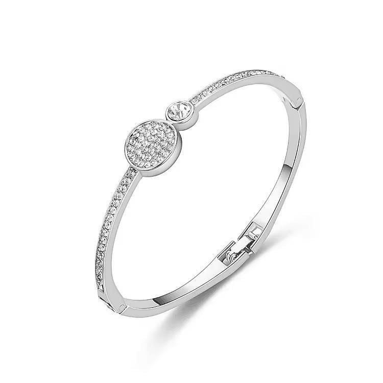 Introducing our GABRIELLA BANGLE - a stunning addition to any ensemble. Made of durable stainless steel with a full diamond design and gold plated finish, this bangle boasts a small waist and magnetic buckle for easy opening. Its geometric design makes it a perfect accessory for weddings or as a gift
