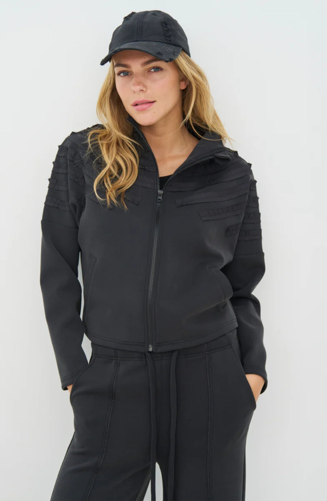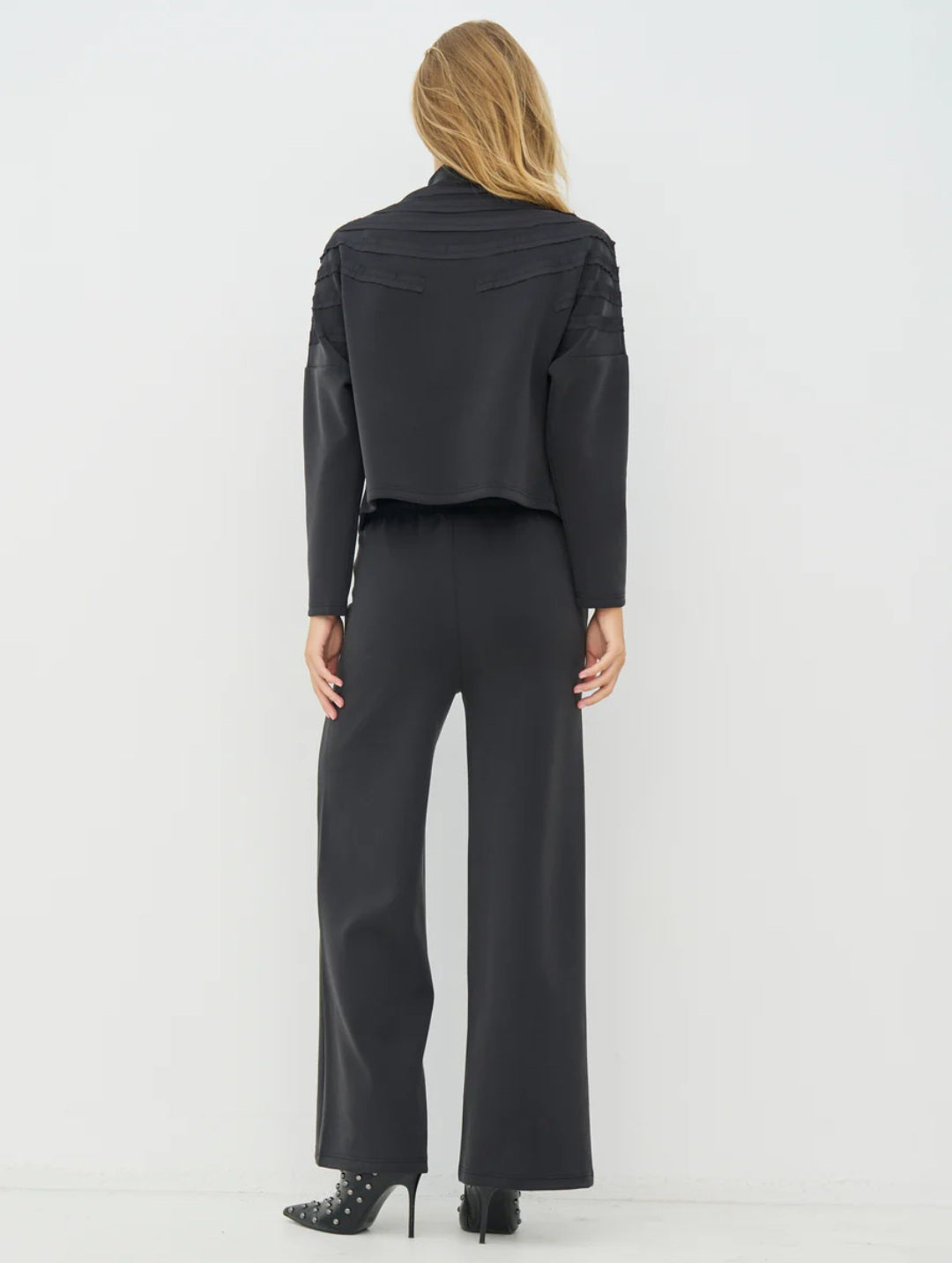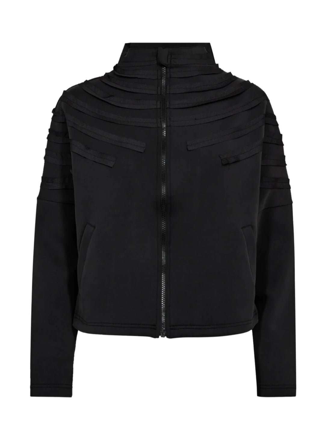 This jacket has a relaxed and clean look with a straight fit and a full front zipper. The front is characterized by decorative ribbons that lay in soft, curved lines creating a subtle 3D effect, while the back is simpler and calmer in expression. The jacket is comfortable to wear and works well as a light layer for everyday use. Style it with the matching trousers for a coordinated look, or wear it over a simple top for a casual outfit.
