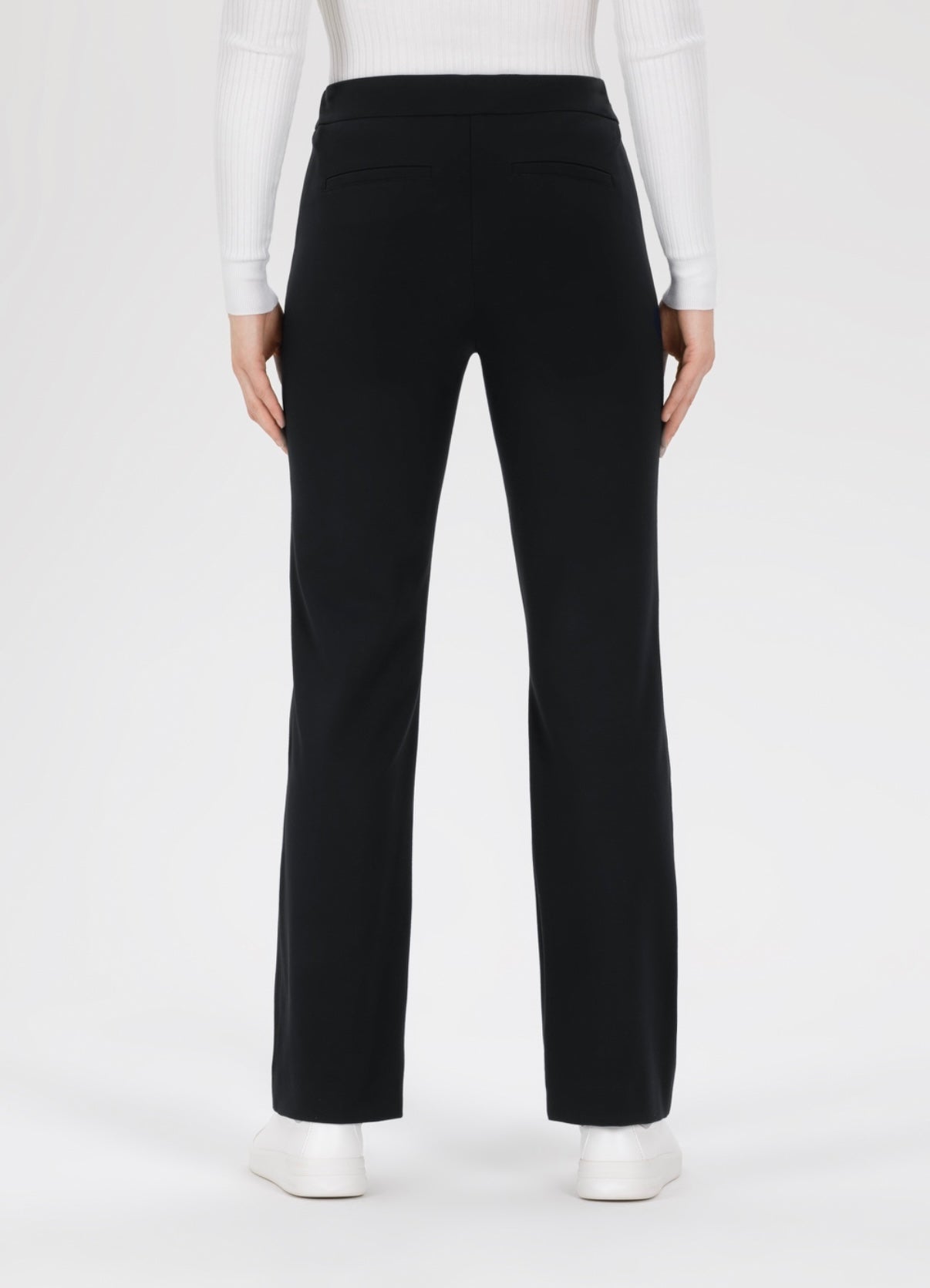 Black Melia straight leg trouser is designed witha mock zipper and fake welt pockets at back