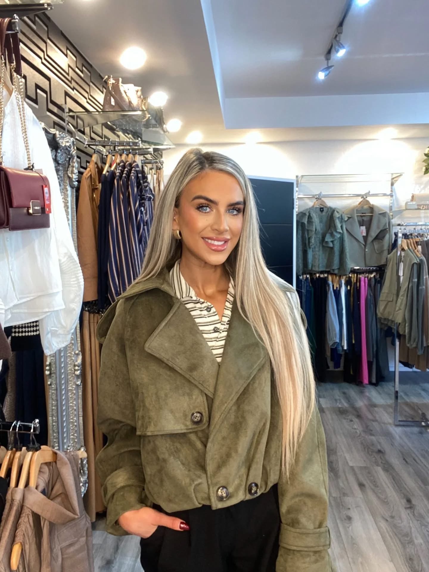 Expertly crafted, this Khaki Suede Jacket exudes sophistication and style. Made with a suede effect, it features a notched lapel collar, buttoned epaulettes, and long sleeves with cuff straps. With a storm flap detail and crossover button closure, this jacket also offers practicality with invisible side pockets.