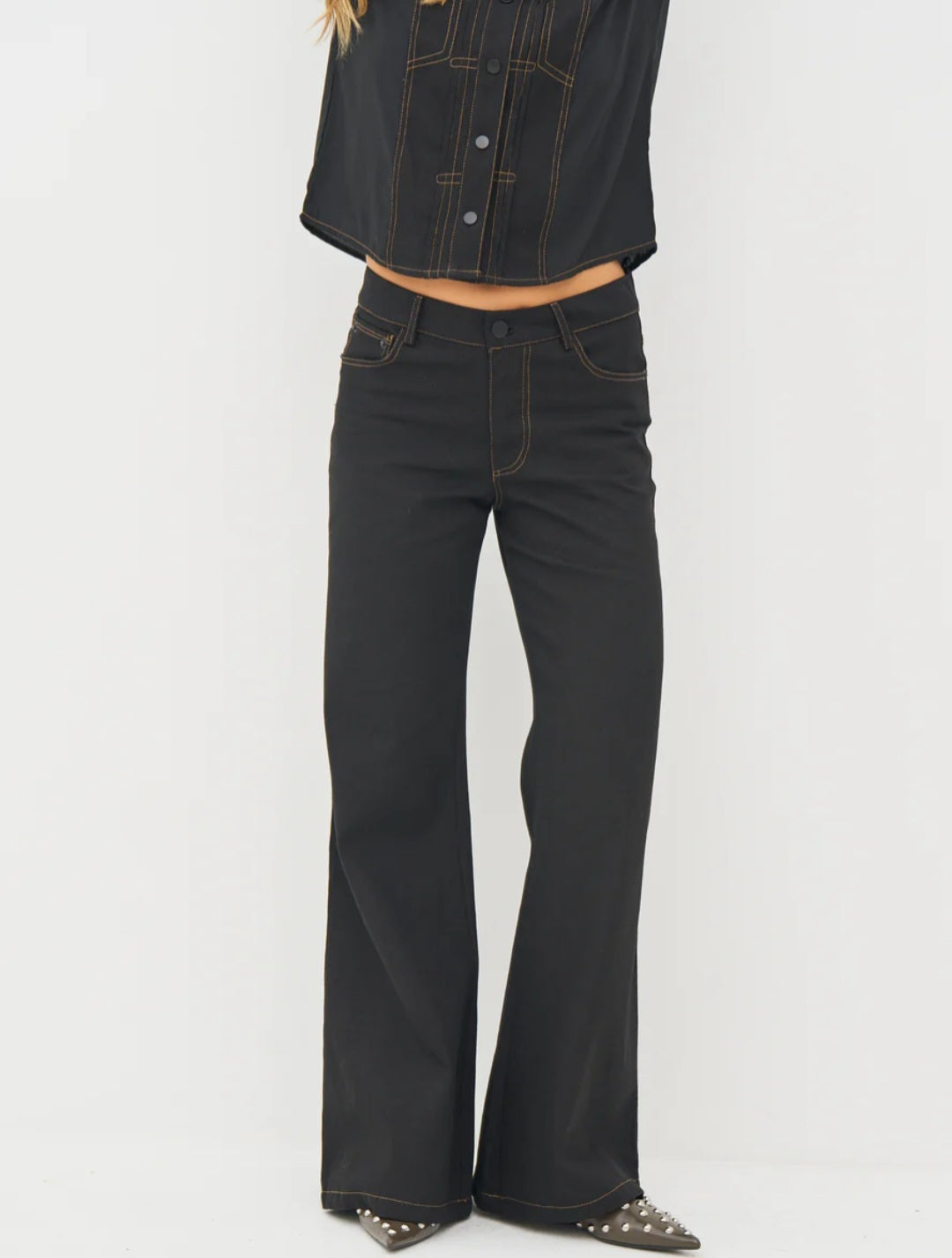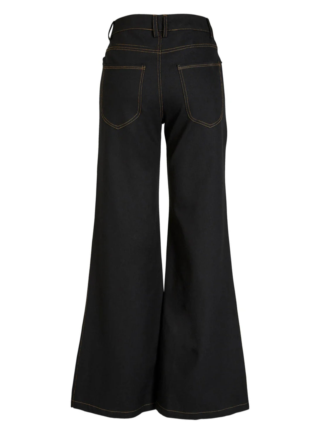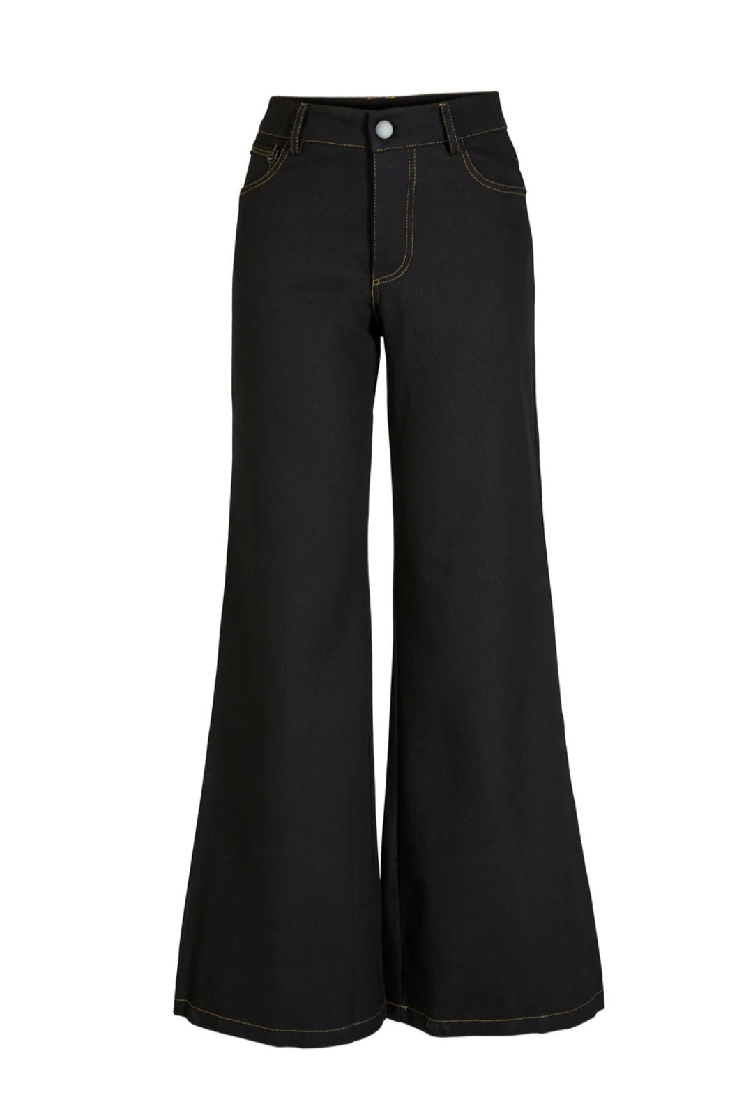 These denim trousers have a timeless look with wide legs and visible contrast stitching that adds a modern touch. The fit is classic with five pockets, belt loops, and a front zip closure with button. The wide legs create a beautiful silhouette and provide great mobility for everyday wear.