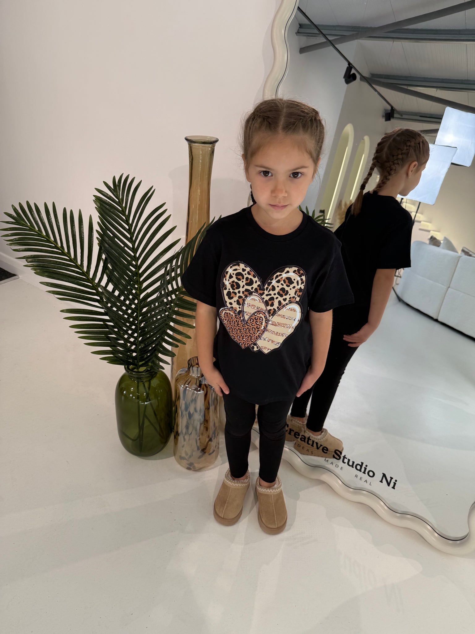 This black t-shirt features stunning leopard print heart details, adding a touch of boldness to your wardrobe. Made with high-quality material, it offers both comfort and style. Elevate your fashion game with this versatile and trendy t-shirt.