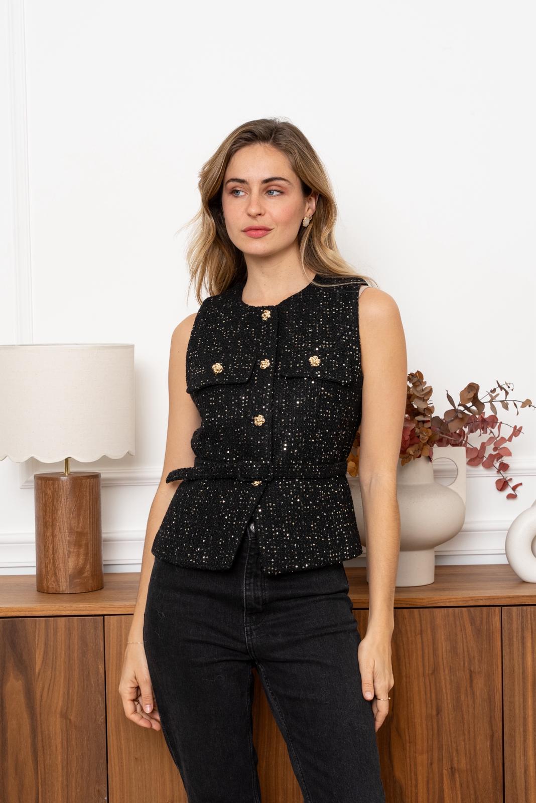 Introducing the Ella Tweed Waistcoat - a stylish piece that adds a touch of sophistication to any outfit. Made from high-quality tweed with a belted waist and gold button details, this waistcoat exudes elegance and refinement. Upgrade your wardrobe and elevate your look with Ella.