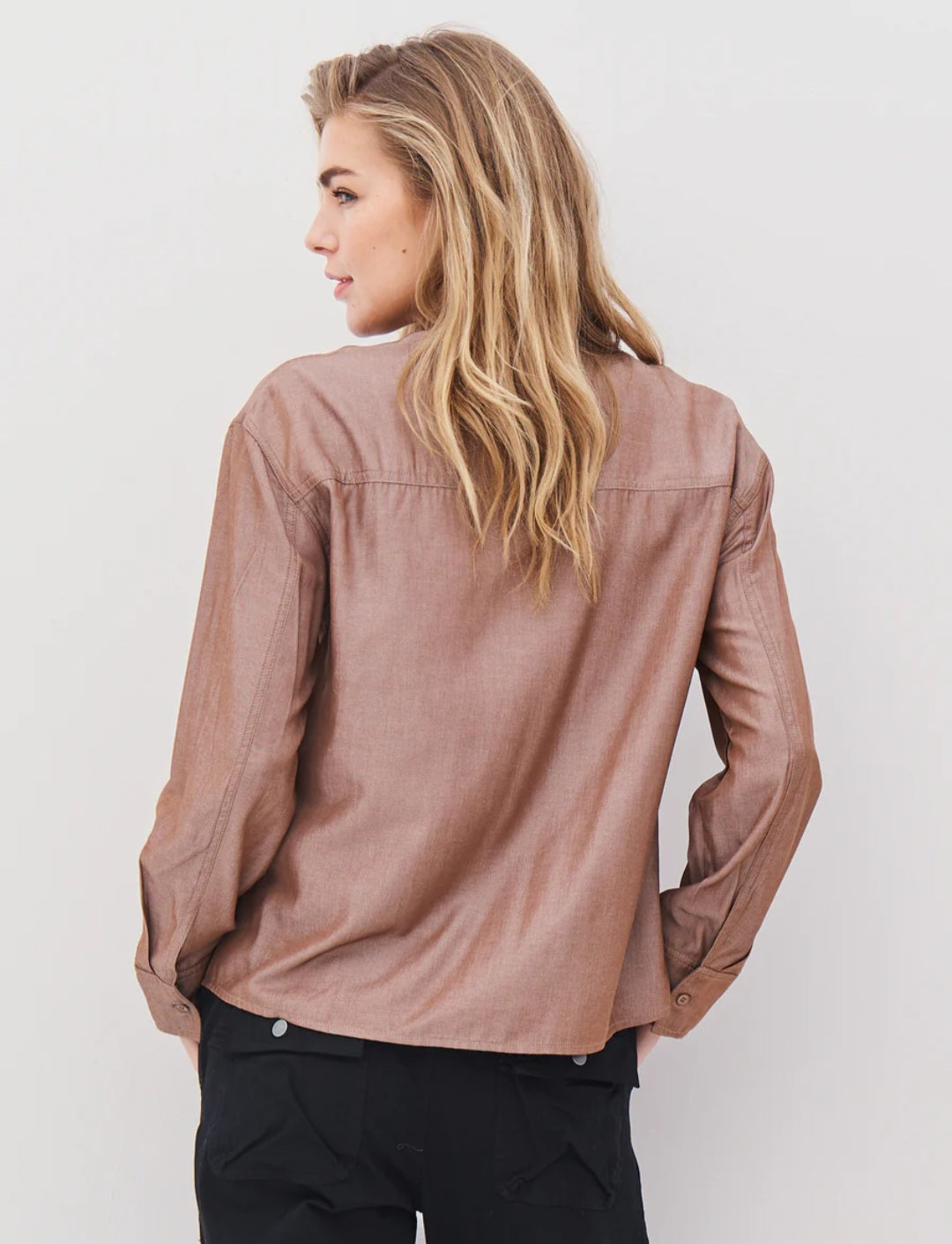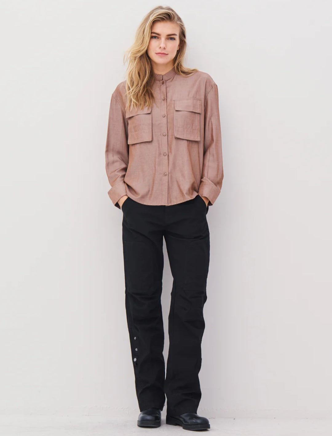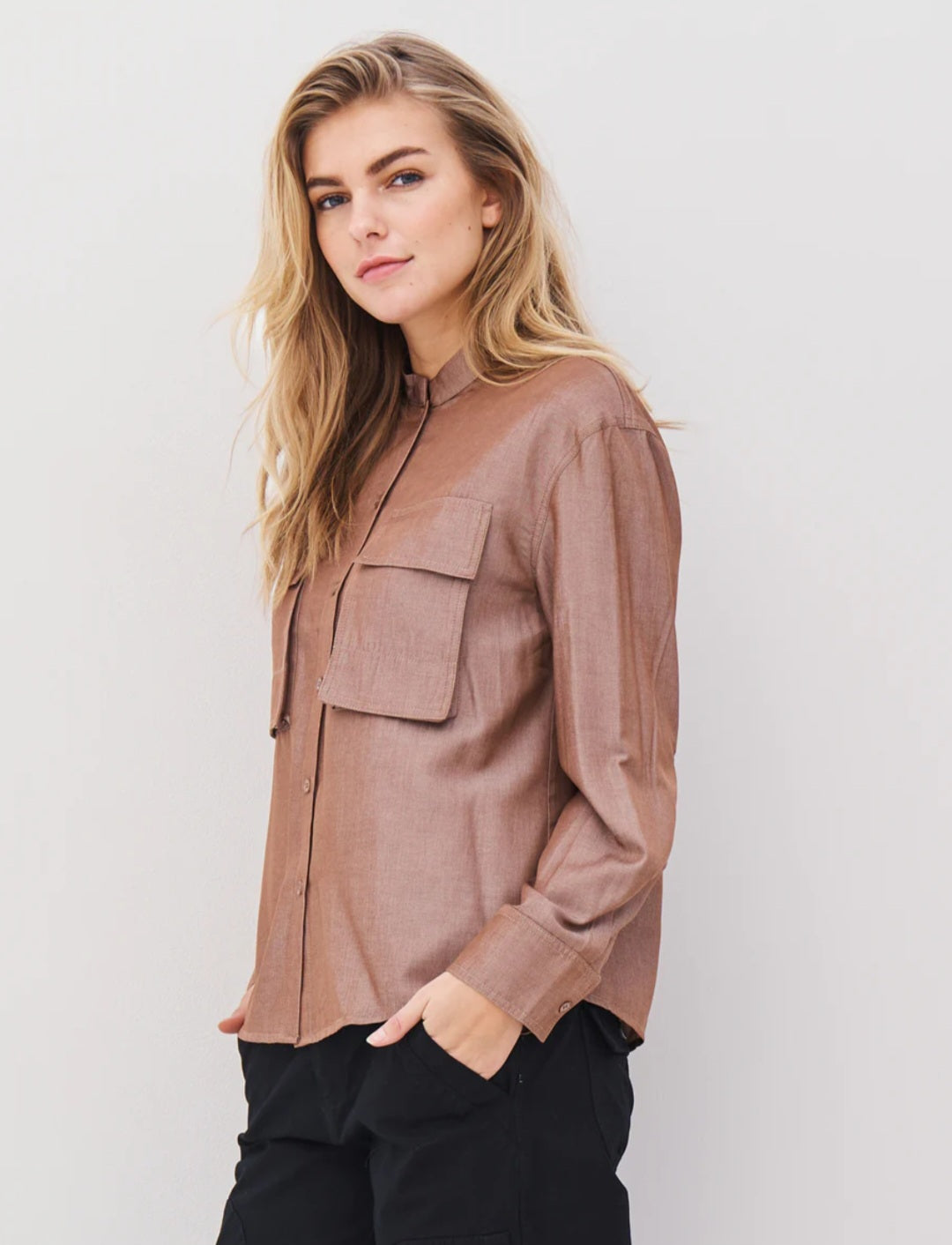 The shirt has a relaxed fit and is designed with a mandarin collar and two large chest pockets with flaps, giving it a practical and modern look. The full button placket at the front makes it easy to style, and the wide cuffs with button closure add a classic touch. The fabric has a slightly shiny surface that elevates the look without compromising on comfort.
