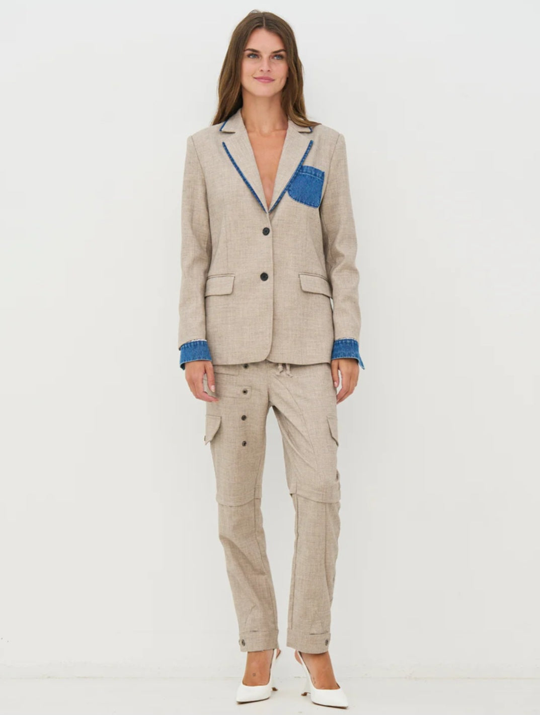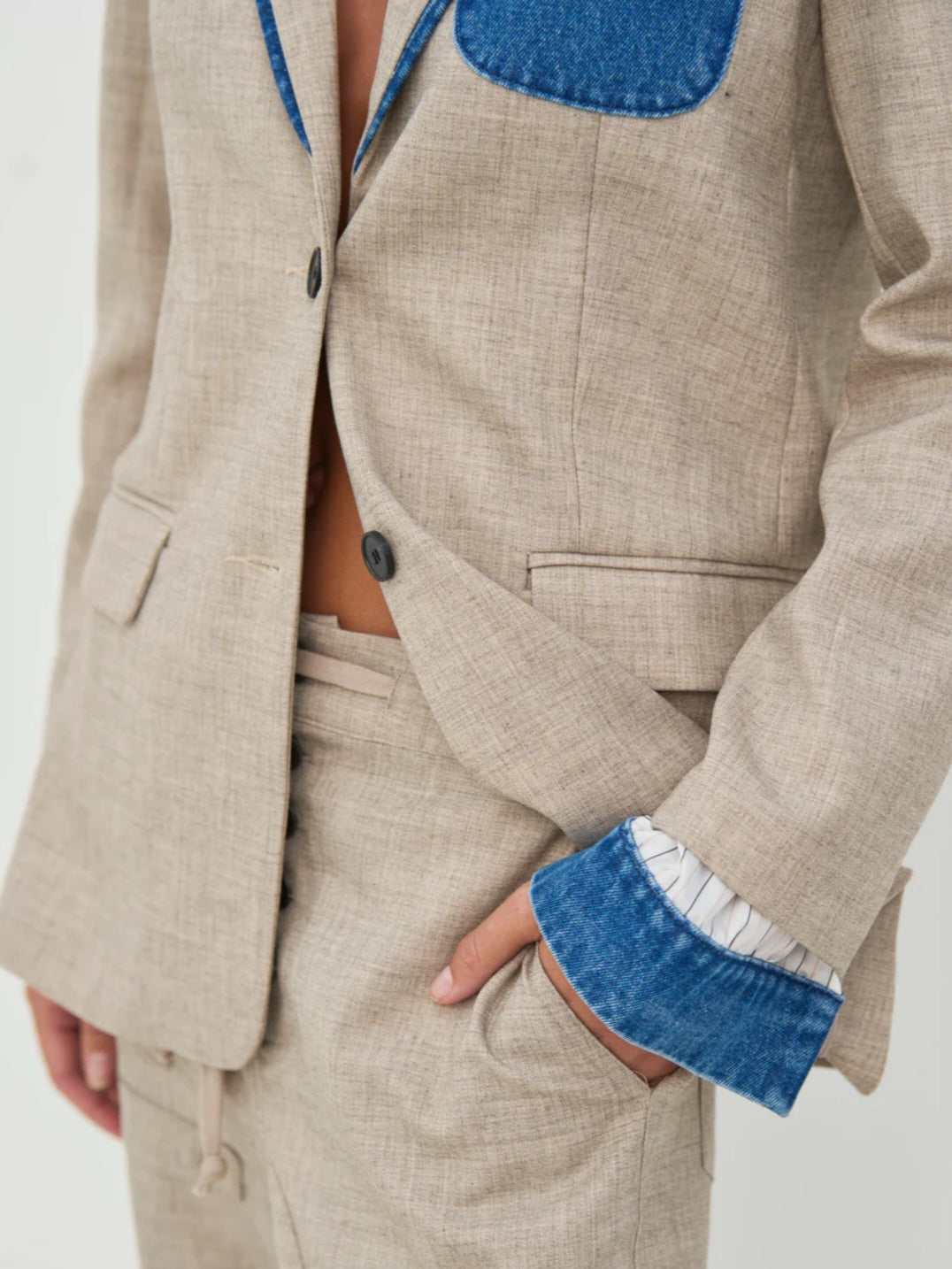 This blazer has a classic cut with a modern twist. It is designed with a lapel, button closure at the front, and a straight fit, making it easy to wear both open and closed. The small denim details at the collar, cuffs, and chest pocket give the blazer a relaxed touch and create a nice contrast to the otherwise simple look. The back of the design is kept clean and classic. Style the blazer with the matching pants for a complete set, or wear it over a top or shirt for everyday wear.