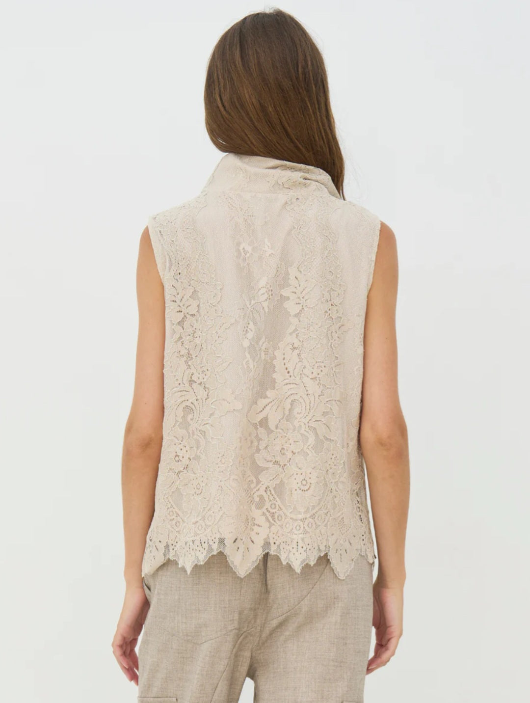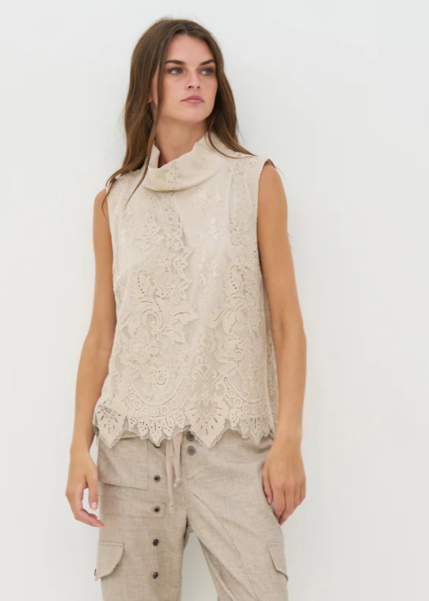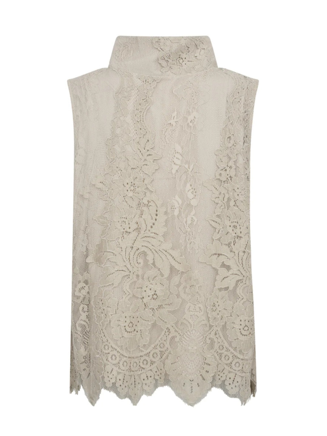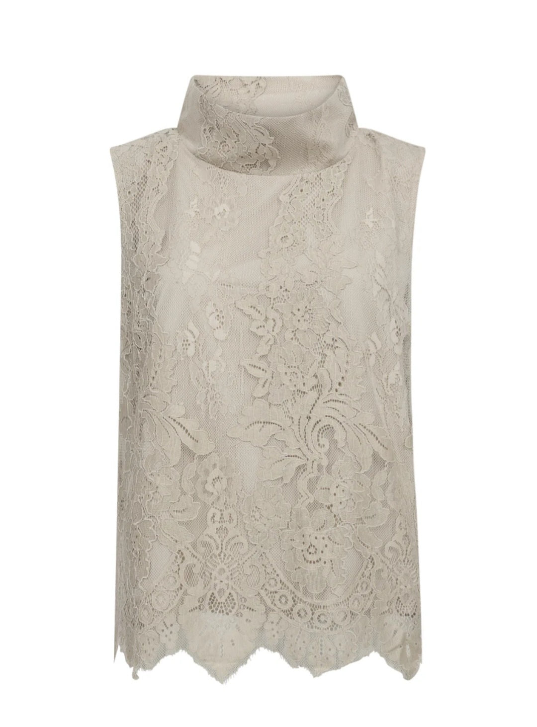 This top is made of lace fabric and has a feminine look with a high neck and sleeveless cut. The lace gives a subtle play on the surface, while the bottom edge is gently wavy and finishes the design in a nice way. The expression is consistent at the front and back, allowing the top to fall smoothly and lightly around the body. It is easy to style the top for both everyday wear and more festive occasions. Style the top with a pair of trousers, a skirt, or under a jacket or blazer.