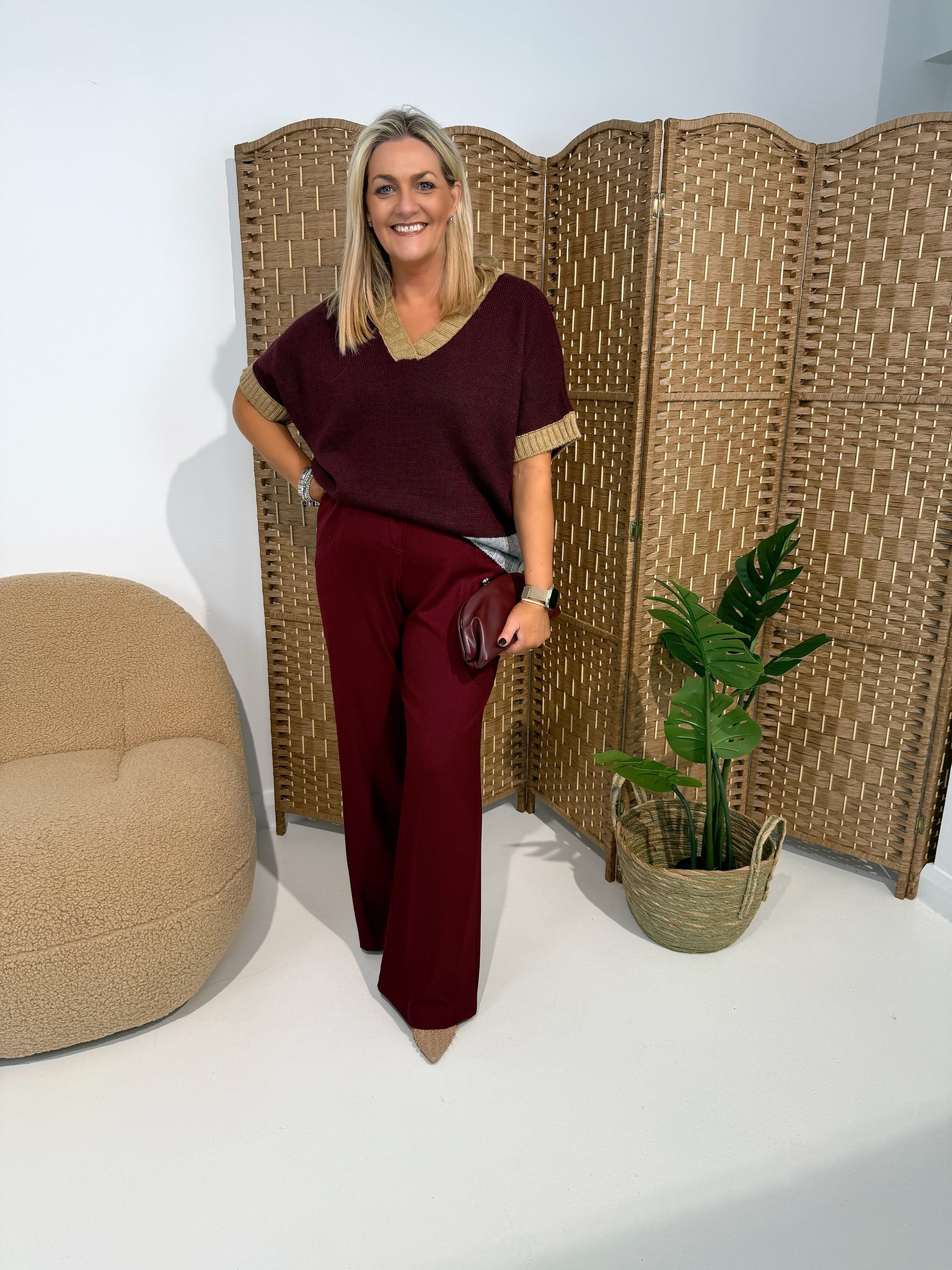 This FLYGIRL burgundy oversized knit features a stylish combination of grey and gold trimming. Perfect for a fashionable yet cozy look, this knit offers ultimate comfort and a touch of luxury. Expertly crafted, it is a must-have for any wardrobe.