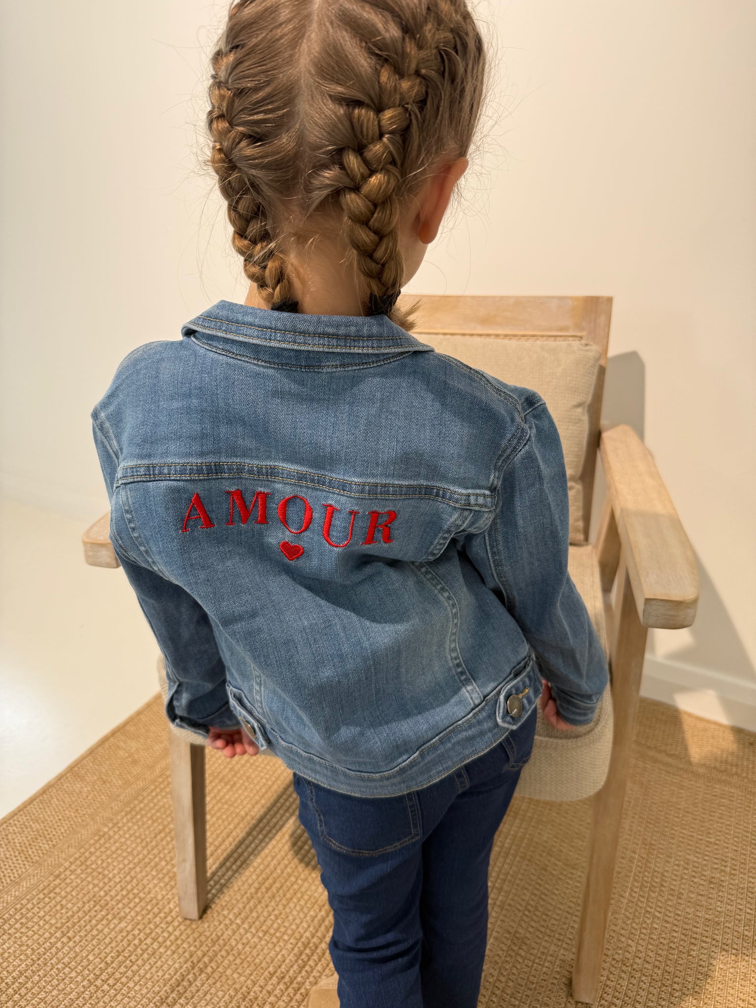 The Amour Denim Jacket is the perfect addition to any girl's wardrobe. Made from a beautiful stretch material, this jacket features a gorgeous amour print on the back. Elevate your denim game with style and comfort.